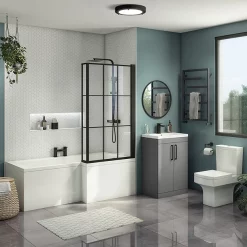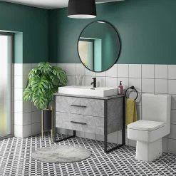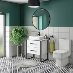 The stylish space saving Arezzo matt teal green semi-recessed basin bathroom combination unit, perfect for renewing the style in any cloakroom, en-suite or smaller bathroom where space limited. It’s stylish modern design hides all unsightly pipework creating a neat modern look, provides ample storage, perfect for a busy family bathroom. Features a eye catching matt teal green finish, contemporary matt black square bar handles, concealed cistern with matt black flush button and a solid round semi-recessed poly-marble basin with worktop.