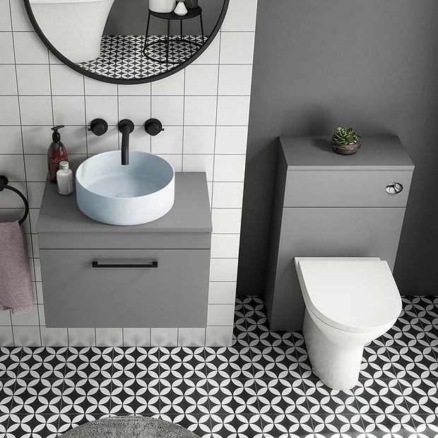 The contemporary matt grey Arezzo furniture package, with it’s clean lines this suite is perfect for renewing the style in any bathroom. The vanity unit’s stylish modern design hides all unsightly pipework creating a neat modern look, helping to keep your bathroom clutter free. Features eye-catching and stylish matt grey finish with a on-trend contrasting modern matt blue round counter top basin and a square matt black bar handles. WC unit comes supplied with a dual flush concealed WC cistern and modern toilet with soft closing seat.