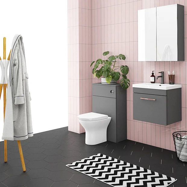 The contemporary matt grey Arezzo furniture package, with it’s clean lines this suite is perfect for renewing the style in any bathroom. The wall hung vanity unit’s stylish modern design hides all unsightly pipework creating a neat modern look. The units soft-closing drawer provides plenty of storage space for toiletries, helping to keep your bathroom clutter free. Features eye-catching and stylish matt grey finish with a on-trend contrasting modern polished rose gold square bar handle. WC unit comes supplied with a dual flush concealed WC cistern and modern toilet with soft closing seat.