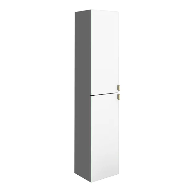 The Arezzo matt grey bathroom furniture range combines up to date looks with practical storage. Features 2 stylish soft close mirrored doors with modern slim brushed brass handles helping to prevent finger prints and smudges. Perfect for adding modern style to any bathroom the space saving mirrored Arezzo wall hung tall storage cabinet with its 3 internal shelves provides plenty of space for towels and toiletries. Supplied with wall fixings.Â