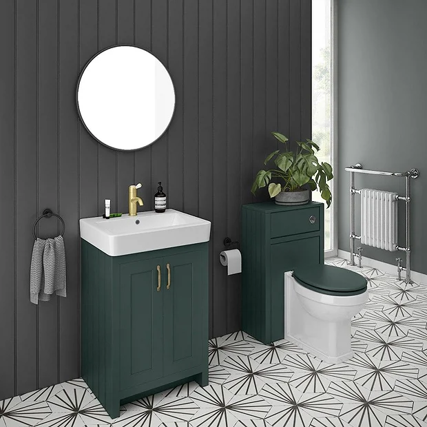 The Chatsworth traditional 560mm wide green vanity unit with wc unit package, Victorian inspired design with a modern twist. The Chatsworth range of charming bathroom furniture features classic styling with a satin green finish cabinet and tongue-and-groove side panelling.
