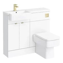 The stylish space saving Brooklyn Gloss White semi-recessed basin bathroom combination unit with brushed brass handles and square flush button, perfect for renewing the style in any cloakroom, en-suite or smaller bathroom where space limited.