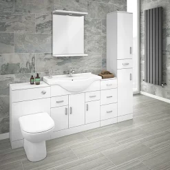 For bathrooms where space is limited the Match 1000mm Furniture Run is the ideal solution. Sleekly designed in a gloss white finish, the furniture run consists of a 500mm double door vanity unit which is paired with a 500mm back to wall unit. The vanity unit is finished with discreet chrome handles and a decorative chrome trim on the back to wall unit.