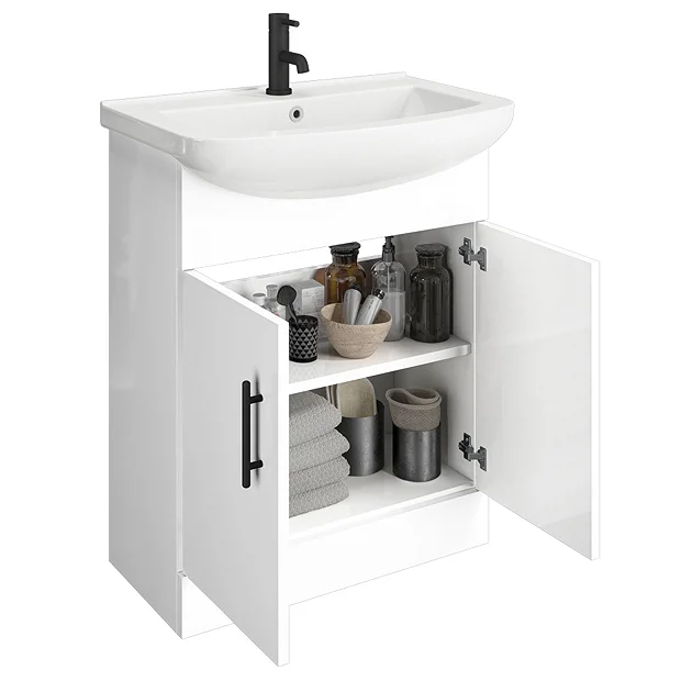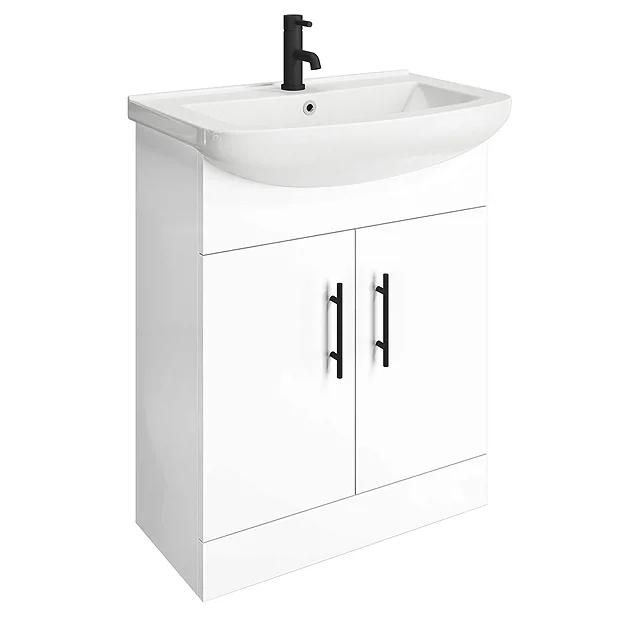 A 665mm wide high gloss white free standing vanity unit with a quality smooth ceramic basin top and matching WC unit with modern toilet, part of the Venice range of bathroom furniture. Features soft closing doors with modern matt black door handles. Provides generous storage space for your toiletries, helping to keep your bathroom clutter free.Â