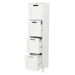 A traditional design matt white 4 drawer tall bathroom storage unit, features classic styling with a tongue-and-groove design. Provides generous storage space for your toiletries, helping to keep your bathroom clutter free.Â